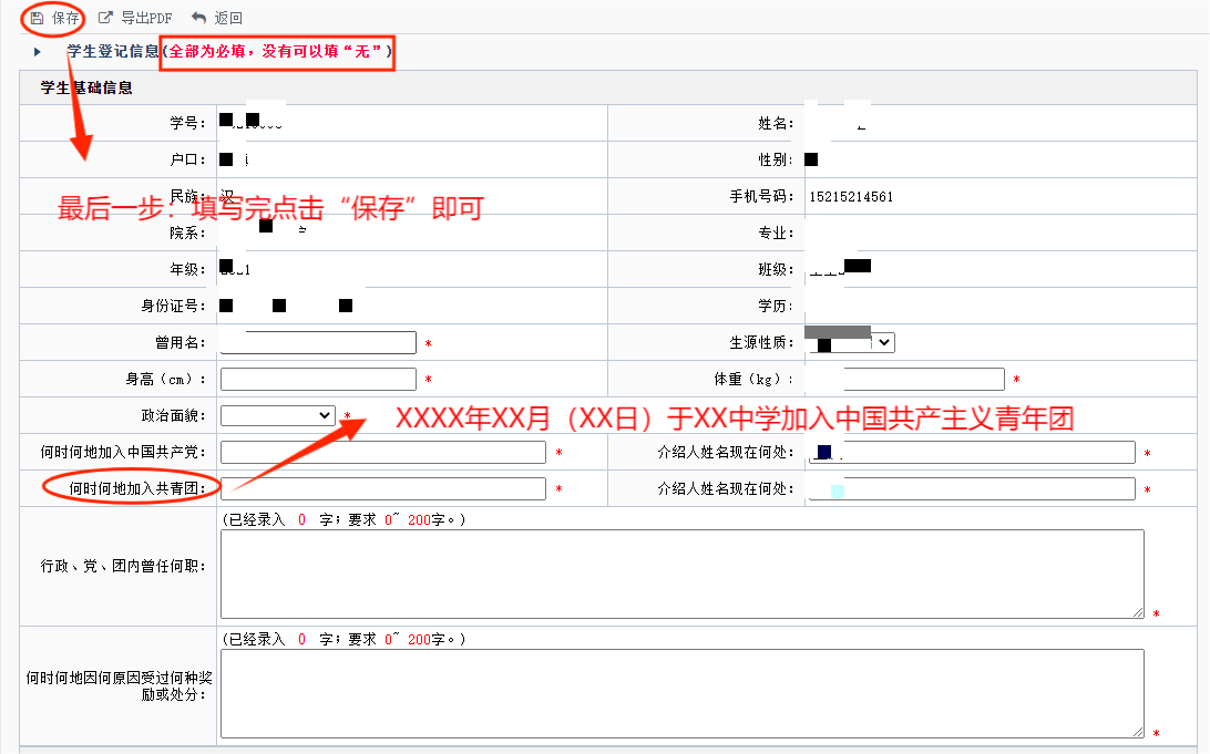 (二)请各学院、班主任提醒各位同学认真填写,仔细核实相关信息,避免因漏填错填对学生毕业后政治审查等关系个人发展的事宜产生影响。